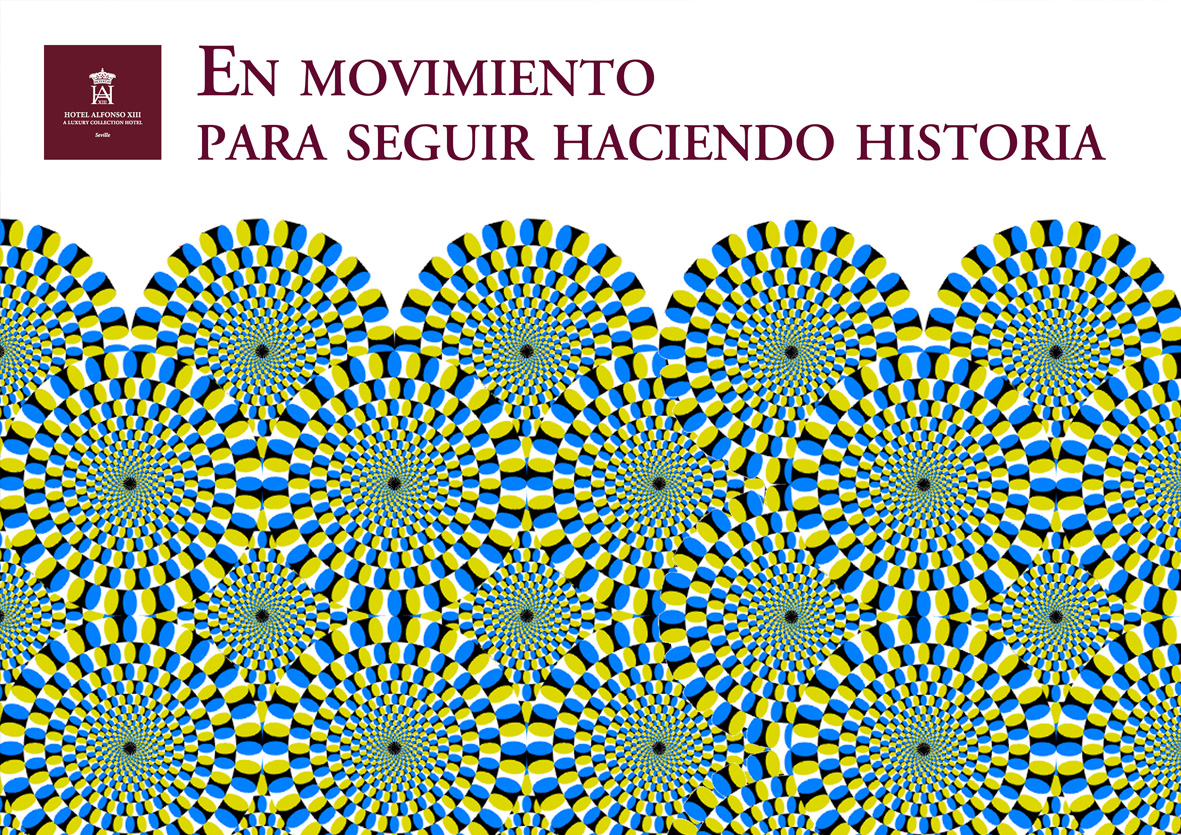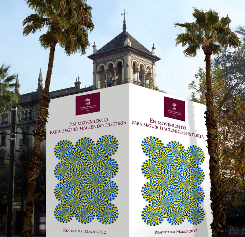 Hotel Alfonso XIII (Sevilla). Proyecto para tapar con una gran lona el edificio durante los meses de reforma del hotel. La imagen utilizada aparte de recordar motivos moriscos tiene la gracia del efecto óptico del movimiento.